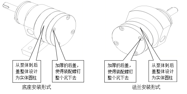 無論是法蘭安裝形式還是底座安裝形式,從泵體到后蓋整體設(shè)計(jì)為實(shí)體圓柱,方便用戶纏繞加溫帶或加熱管;厚實(shí)的后蓋,讓裝配螺釘沉下去,形成整齊的平面,即保證了在較高的溫度下,泵的零部件不會(huì)因發(fā)生變形卡死,又方便了加熱套的裝配。